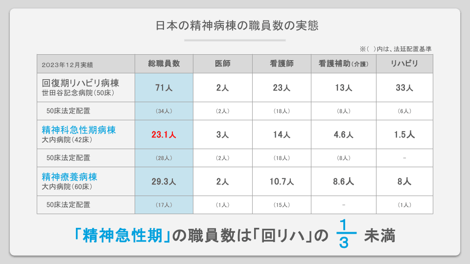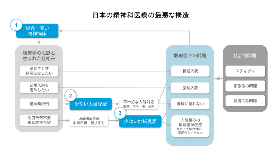 こうした制度的・社会的要因が重なり合い、長期入院が世界一多い精神科病床を支えるという負のループが生まれているのです。
