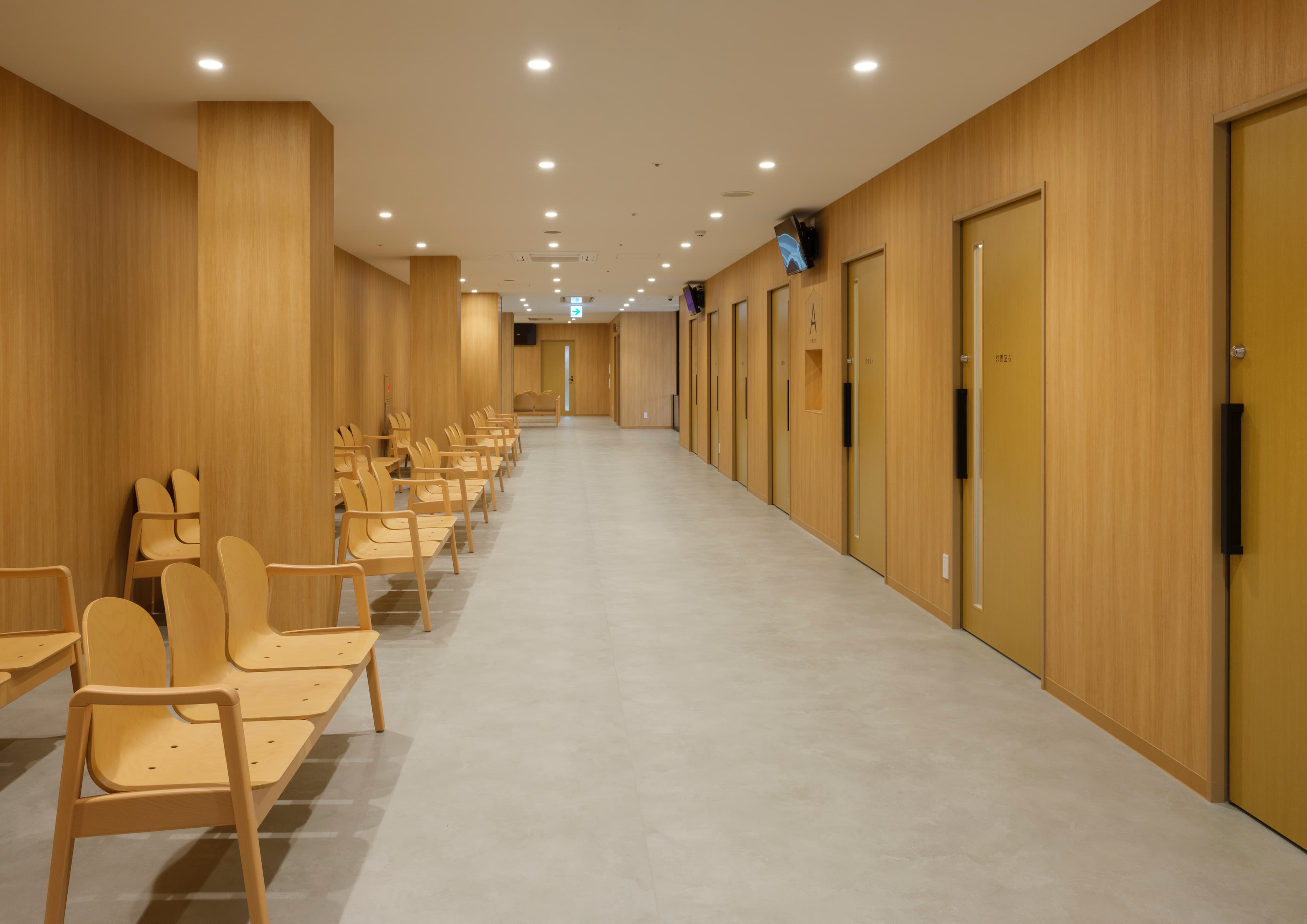 10室ある診察室は、さまざまな患者さんに対応できるように設計されています。診察室も、リラックスして過ごせるように木目調のインテリアです。