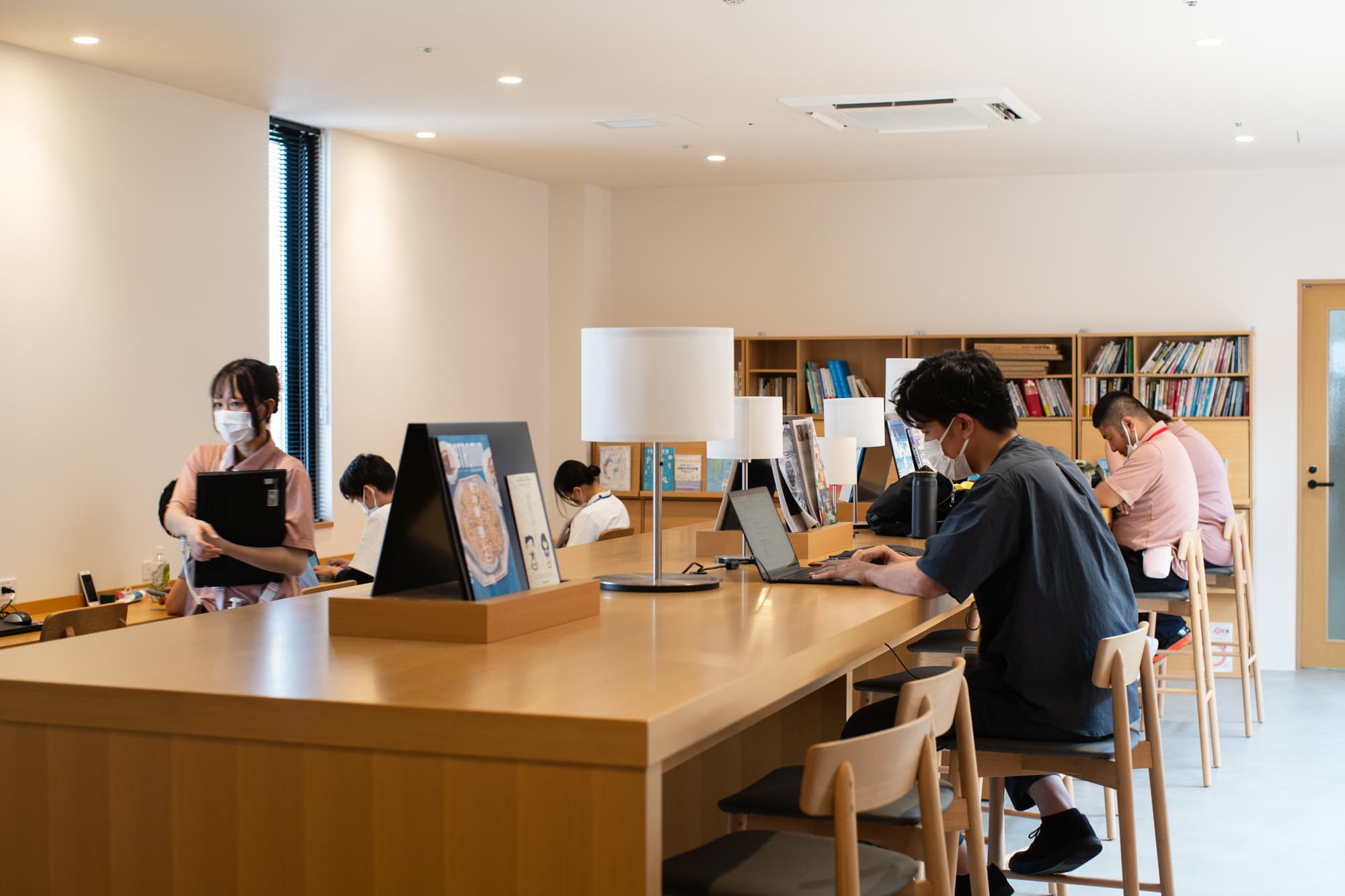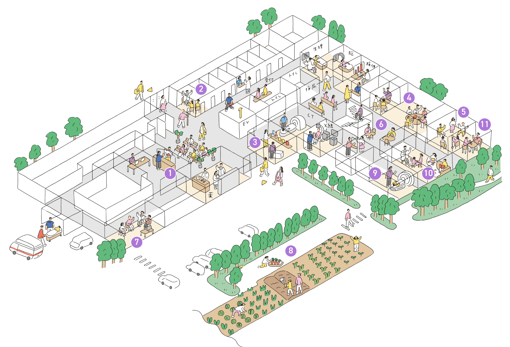認知症に関するあらゆる相談を受け付ける認知症疾患医療センター、発達障害や学習、行動面の課題をサポートする発達診察室もあります。診察や検査を待っている時間を過ごしてもらう外来スペースには、一息つけるようにテーブルと椅子を置きました。病院の外には、車で通う人たちのための広い駐車場や、地域の方々と一緒に作業する畑もつくられています。