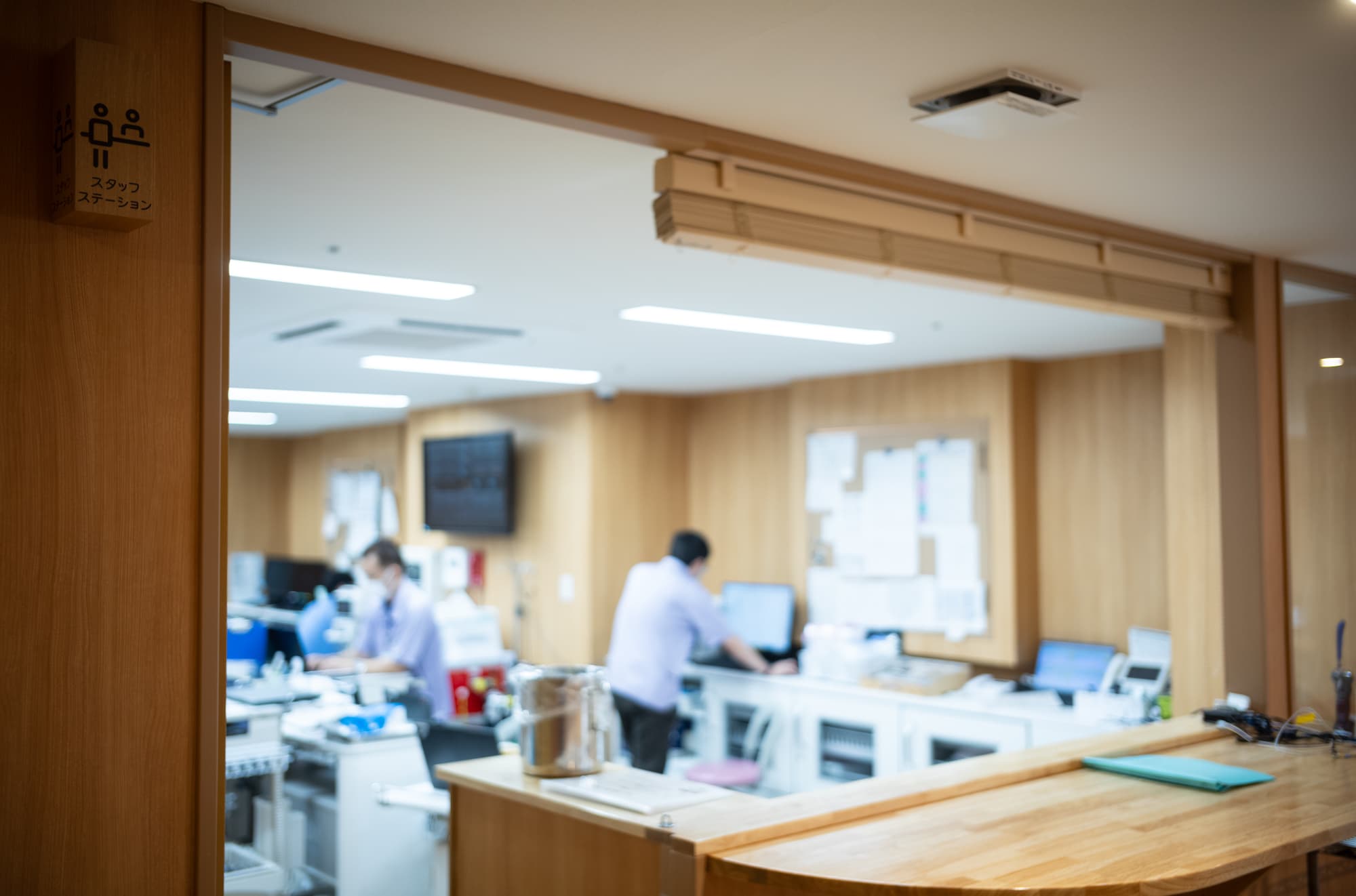 多職種が集うスタッフステーションは、患者さんとスタッフが垣根なく、気軽にコミュニケーションを取れるように設計されました。取材の日には、オープンなカウンター越しに、患者さんがスタッフに声をかけて談笑する姿を見かけました。
