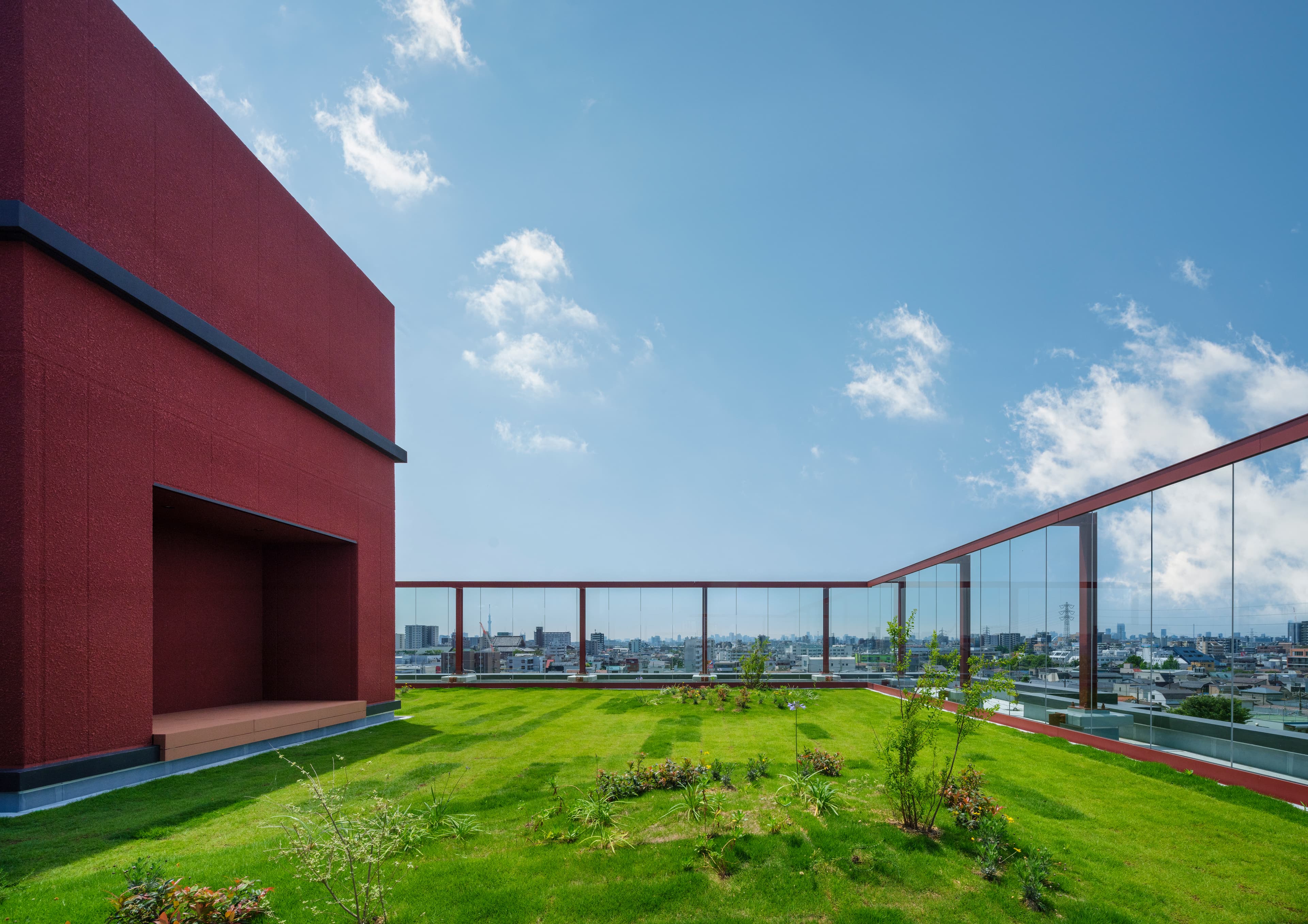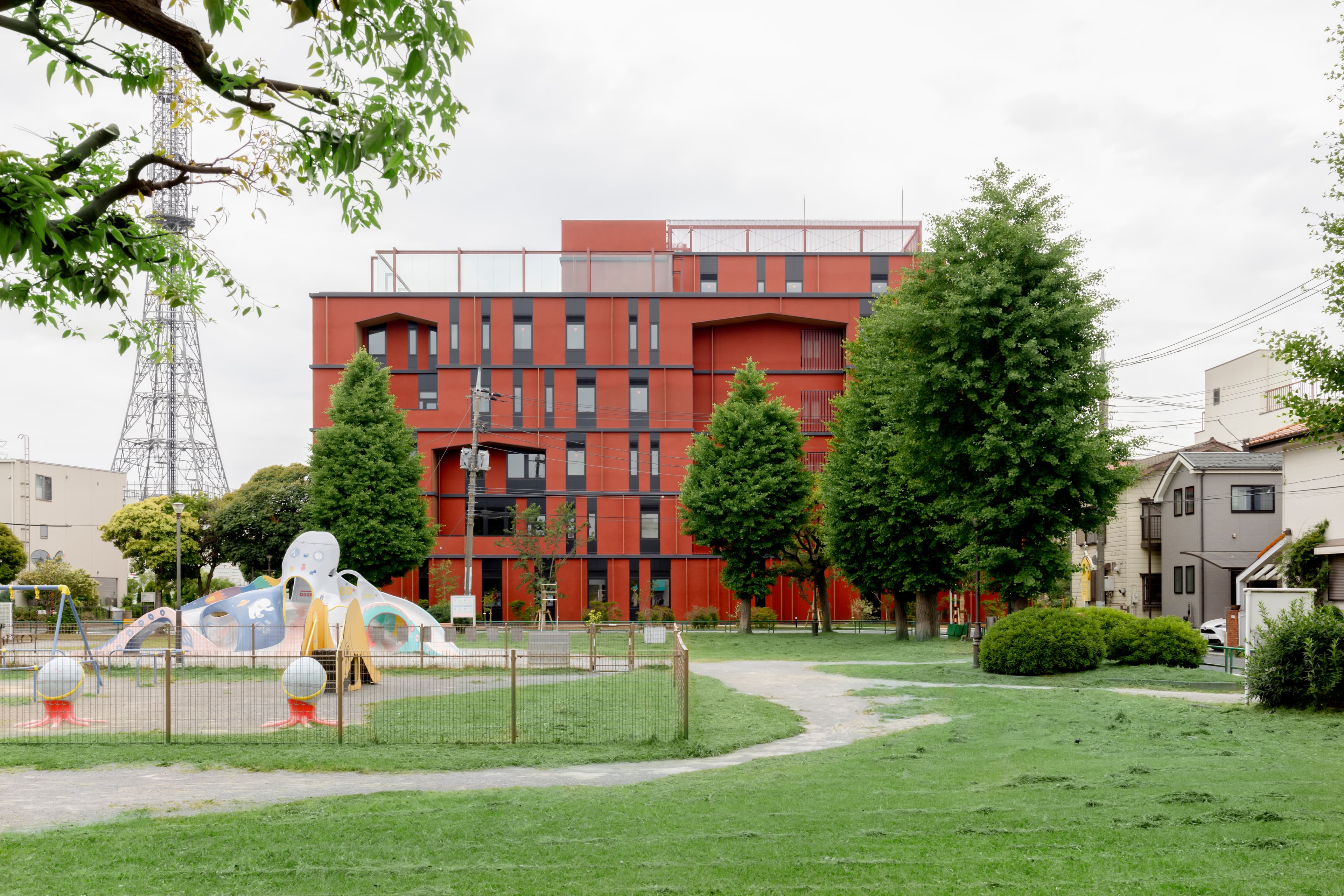 場所は、東京の西側・足立区の真ん中あたり。お大師さんで知られる下町・西新井、タコ型滑り台発祥の地とされる新西新井公園に面しています。2024年に竣工した6階建ての新しい病棟は、赤いレンガ色が印象的です。