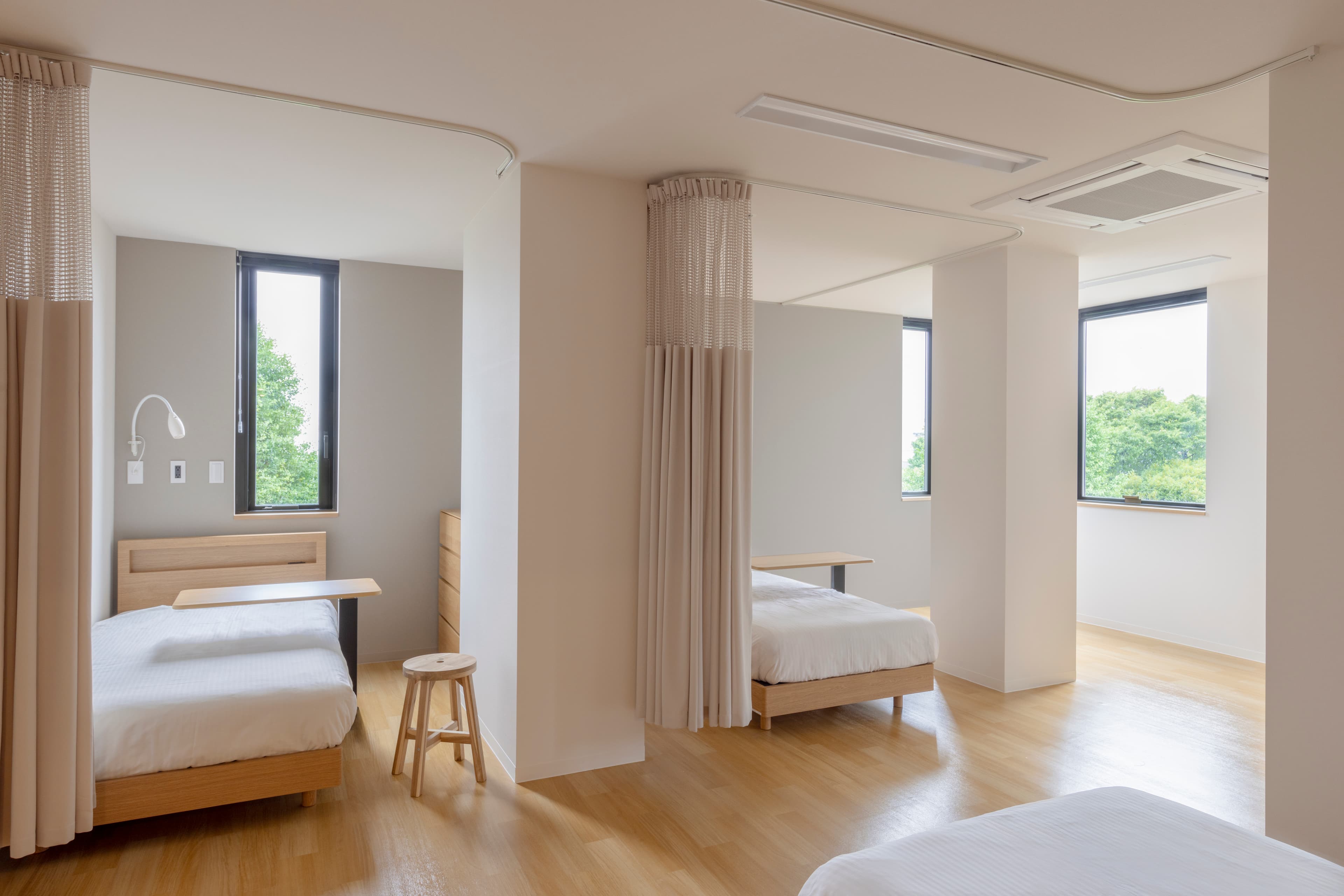 病室は、患者さんが安心して静かに過ごせるようプライベートに配慮。ほとんどが個室で、多床室(4人部屋)も仕切り壁を設置しています。いずれもゆったりと空間が取られており窓から公園の緑が見えるお部屋もあります。
