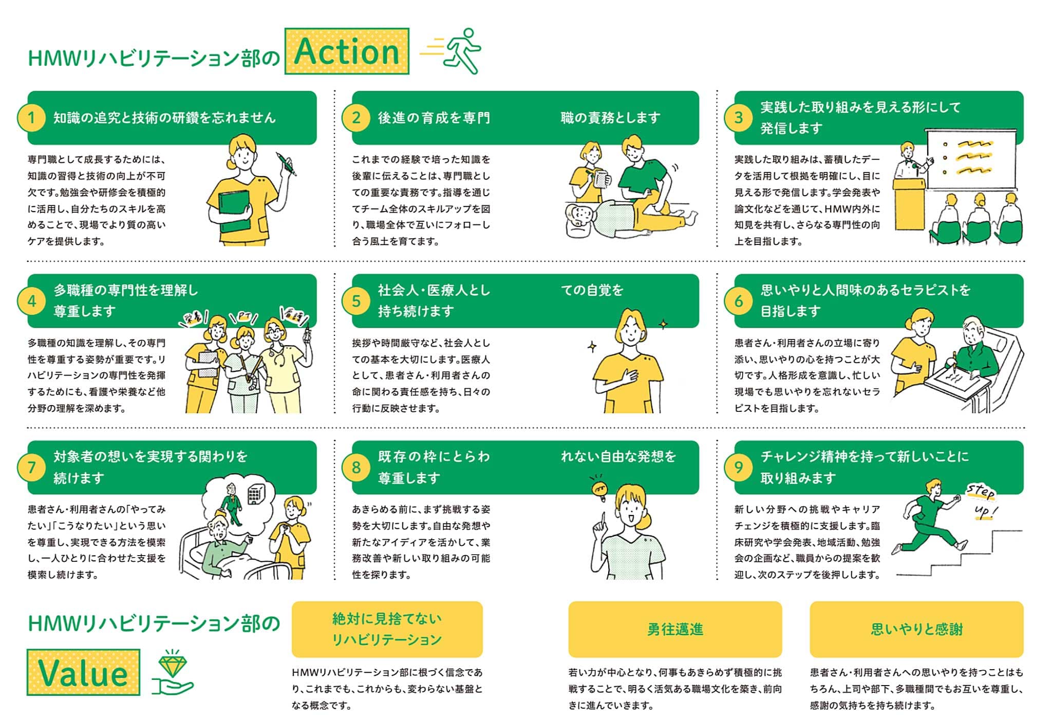 池村さん「リハビリテーションは、患者さん・利用者さん一人ひとりの未来を考えて、その人らしさを支える仕事です。僕たちの関わり次第で人生を左右するかもしれないんですね。だから部のミッションは『人生に関わる覚悟を持って、真剣にリハビリテーションを実施します』としました。以前のミッション『絶対に見捨てないリハビリテーション』は僕らの信念でもあるので、引き続きバリューとして残しています」。