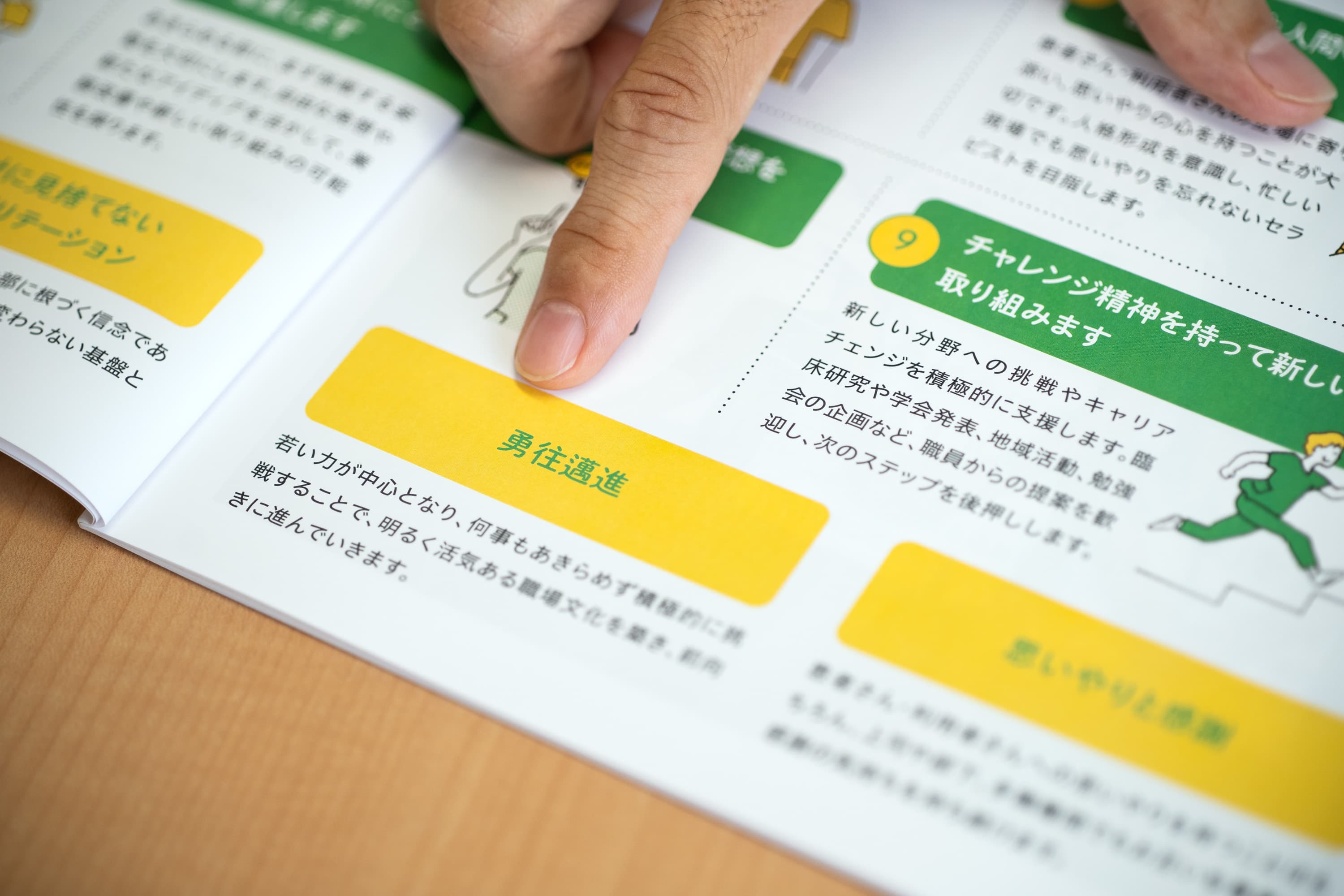 昨年、池村さんを含むエリア部長8名は、グループの理念「じぶんを生きる を みんなのものに」のもとで、リハビリテーション部が目指す未来を議論する合宿を実施。部としてのミッション、アクション、バリューを掲げました。