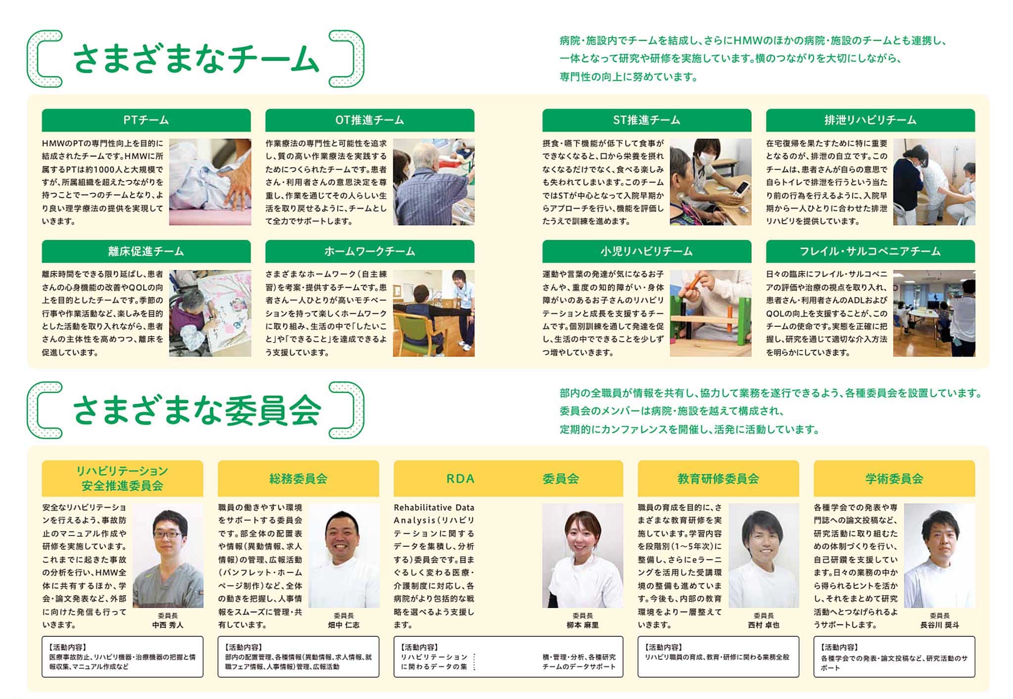 現在、リハビリテーション部では、研究や研修を実施して専門性を高めていく10のチームと、部内の全職員が情報を共有して協力しあって業務を進めていく5つの委員会があります。チームの立ち上げにあたって、グループ全体からメンバーを募集すると全国から手を挙げる人が集まってきたそうです。