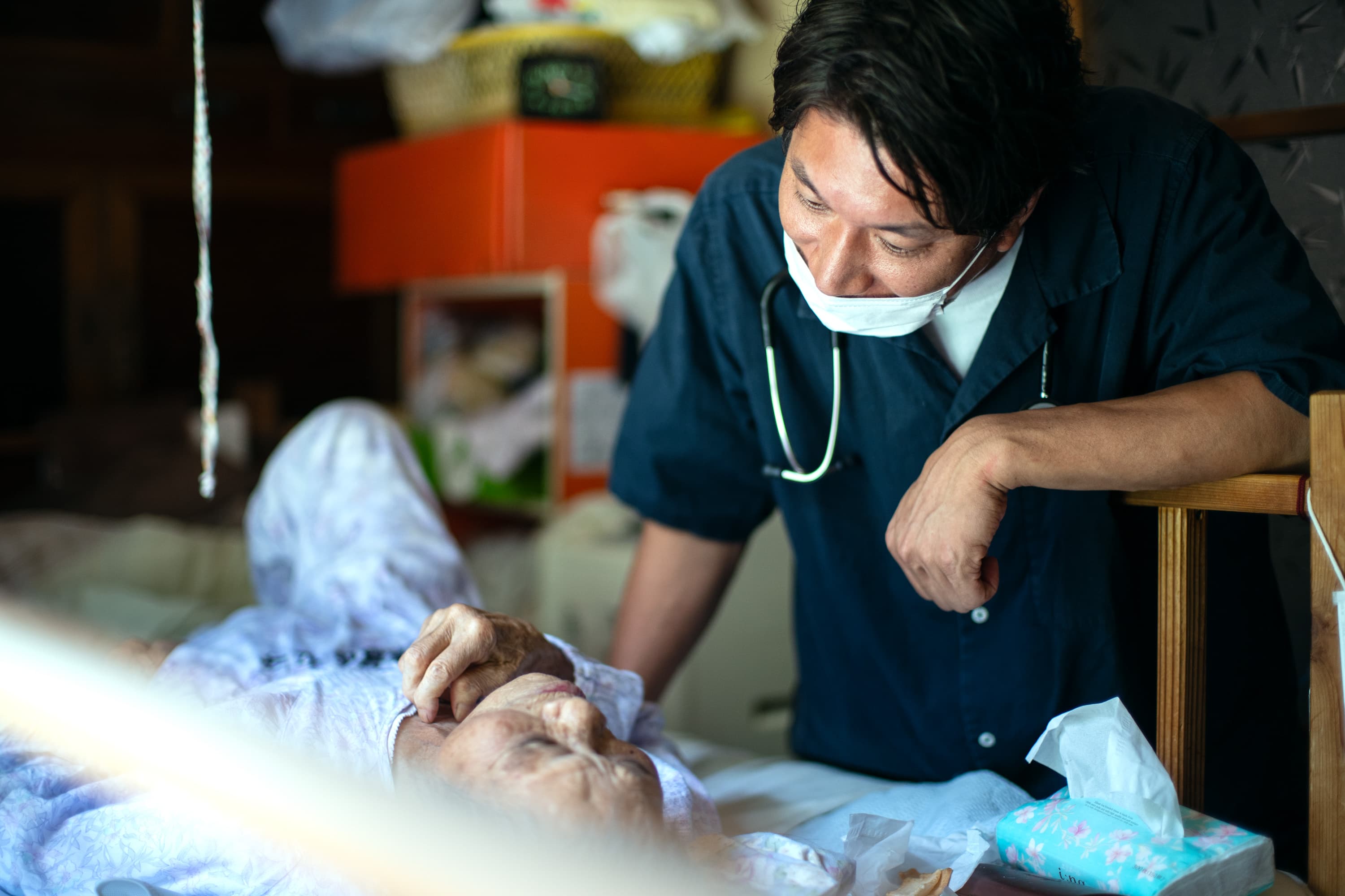 同グループの「おうち診療所 神山」では、医師である武久さんも看護師や療法士も私服で勤務しており、スタッフは武久さんを「代表」「先生」ではなく「たかちゃん」と呼んでいます。職種間のヒエラルキーのない状態のなか、それぞれが専門性を重ね合いながら患者さんに向き合っています。患者さんと医療者も、とてもフラットに関係しています。ある日、診察を終えた武久さんは、「ところで、先生はいつ来るんですか?」と患者さんに聞かれたこともあるそう。日常に溶け込んだ、やわらかな診察のようすが伝わるエピソードです。